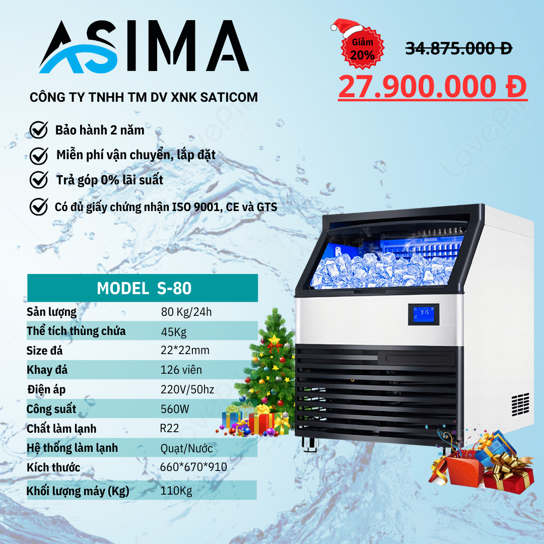 👉 Máy làm đá viên 80Kg ASIMA cho ra đá viên vuông nhỏ, đều viên, tinh khiết, thích hợp cho quán cà phê, trà sữa, quán ăn nhỏ.